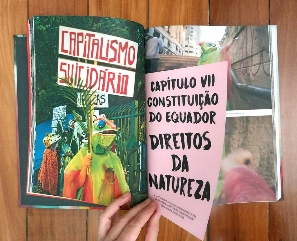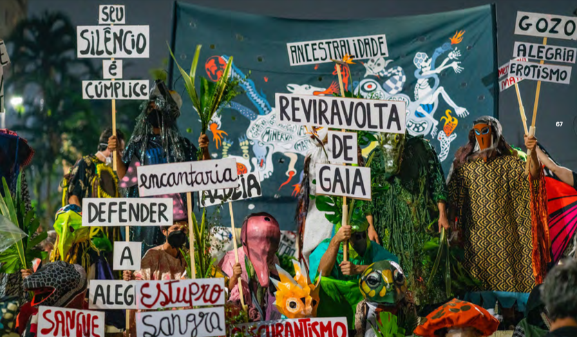 O aspecto mais relevante que nos interessa aqui sublinhar é que se trata de uma forma de artivismo que não se confina no âmbito do humano, que não se limita a demandar direitos apenas para aqueles que pertencem a espécie homo sapiens, que não enxerga uma responsabilidade ética apenas envolvendo as pessoas mas se lança ao imprescindível âmbito de uma ética inter-espécies. Em um dos textos de chamamento para os atos públicos do coletivo Reviravolta de Gaia, convoca-se os humanos a assumirem as figuras e as máscaras da fauna e da flora, a pensar modos de expressão artístico-cultural no espaço público que levem a sério a tarefa de defender biomas devastados na época geológica do Antropoceno: “porque nos reconhecemos parentes de rios, pedras, montanhas e fungos, porque sabemos que biomas são seres de direito” (p. 148). A conjuntura intelectual em que este fenômeno pode ser enquadrado foi explorada com maestria pela tese de doutorado em filosofia de Juliana Fausto, a Cosmopolítica dos Animais (PUC-RJ, 2017, depois publicado em livro pela n-1).