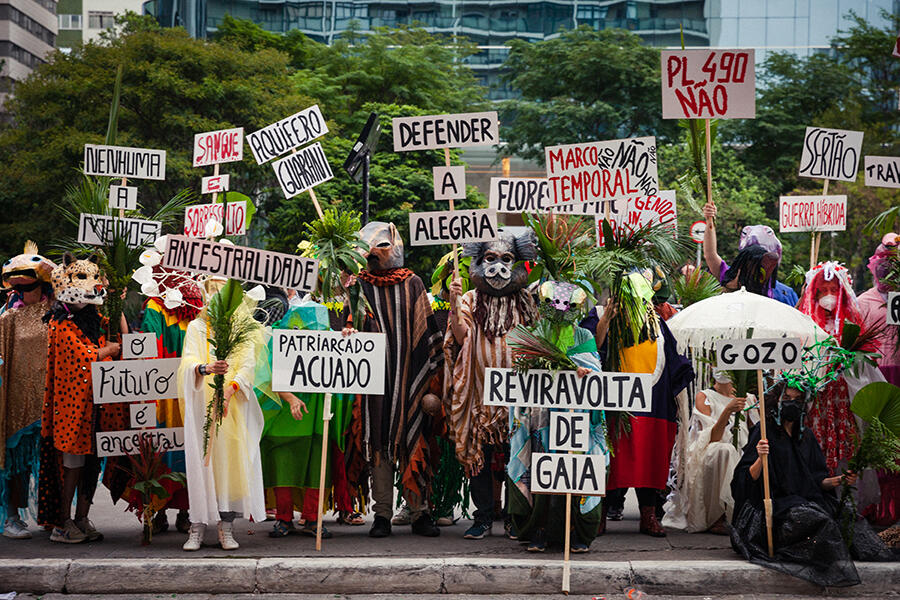 O projeto Reviravoltas de Gaia pretende se insurgir contra a hidra capitalista [*] através da organização de atos públicos em que confluem a arte e o ativismo. Criada em 2021, em meio à pandemia de covid-19, num período em que o Brasil já havia superado o número de 580.000 vítimas fatais do coronavírus em conluio com o desgoverno, a iniciativa inicialmente surgiu como contestação cívica da tese do Marco Temporal (PL 490, STF), considerado pelos idealizadores como “um ataque aos povos originários de uma terra que habitaram e habitam desde tempos imemoriais.” (p. 6)